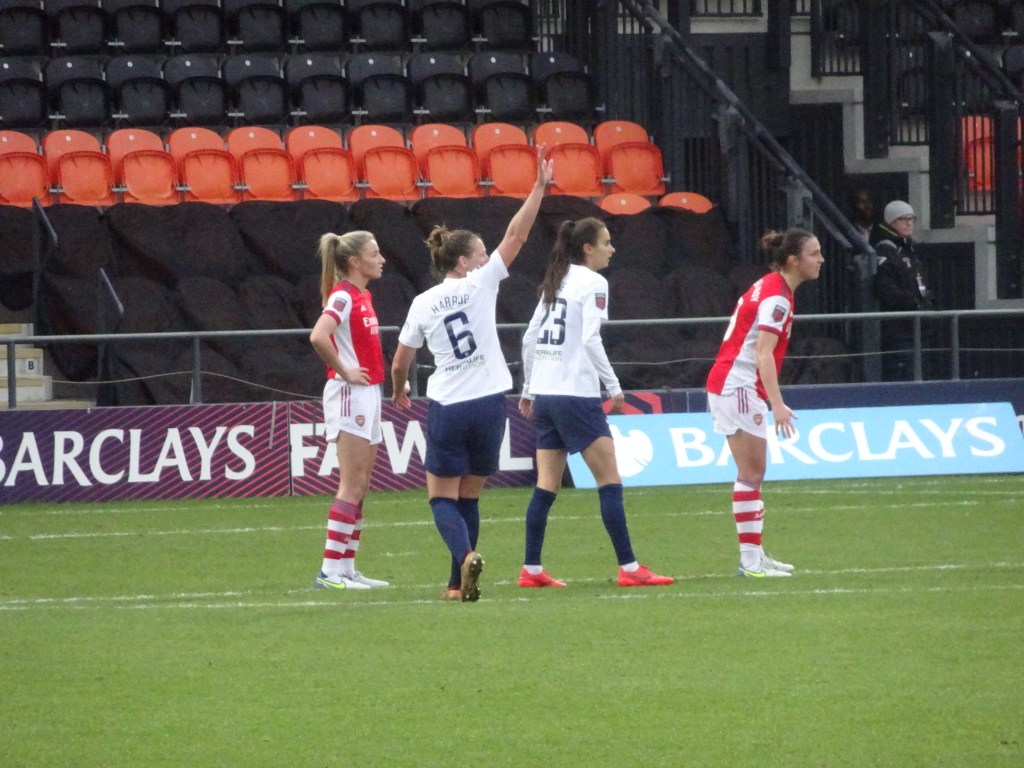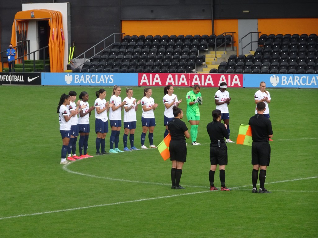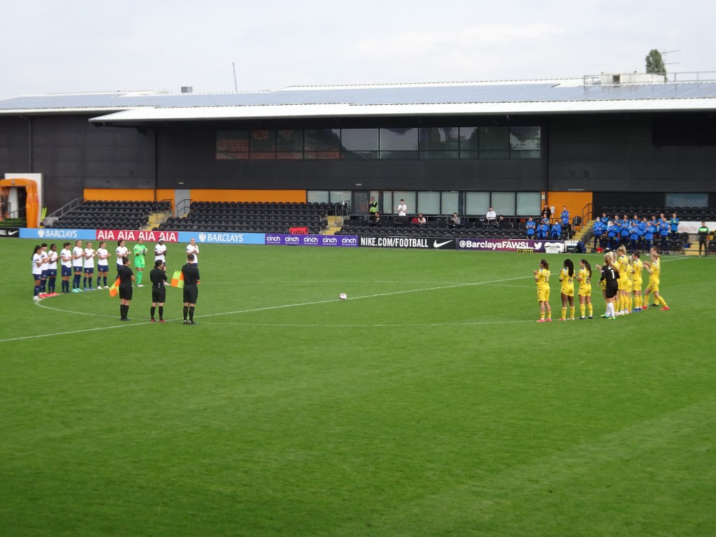 Tottenham came back at Arsenal in the 59th minute with Chi taking on Catley and shooting from an angle but her effort was gathered easily by Zinsberger in the Arsenal goal. A minute later Arsenal came straight back at Tottenham with good passing of the ball which found Maritz who shot from distance but Korpela got down quickly to her right post to pull off a great save. After riding their luck a little in the first half Tottenham finally got their breakthrough in the 64th minute when Graham shot from an angle, the ball rebounded in the Arsenal box before being turned into the net by Rachel Williams to give Tottenham the lead. Tottenham should have had a second 6 minutes later when Captain Zadorsky found herself unmarked in the Arsenal box after a corner, shot but her effort was parried away to Neville who blasted over the bar from point-blank range. Arsenal looked to get back into the game and in the 74 minute Little almost found herself clear through but she was well tracked by Bartrip who got a boot in to defect Little’s effort out for a corner.