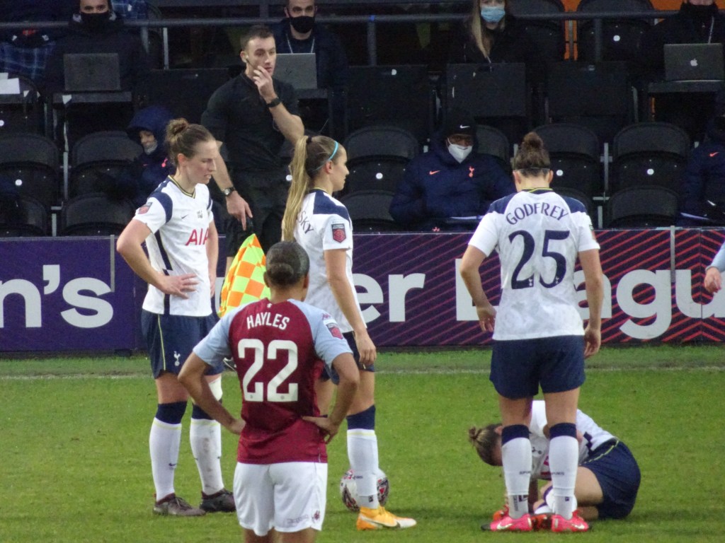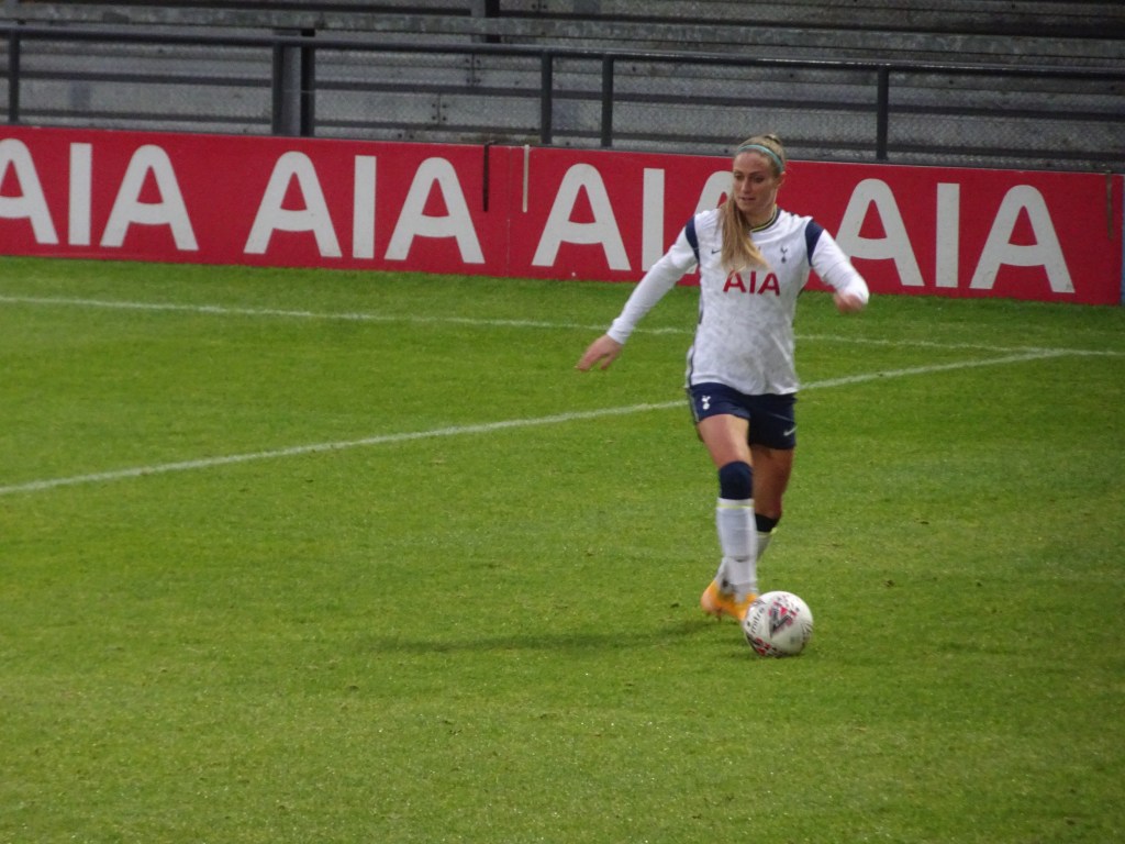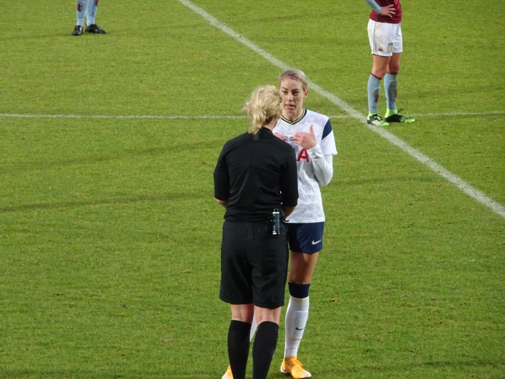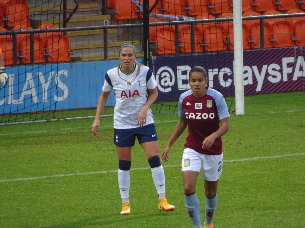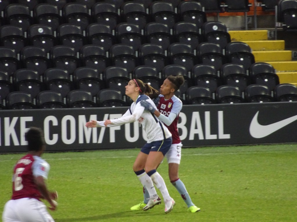 Villa’s goal gave the visitors confidence and they matched Tottenham as the game became more equal and became a battle of the midfielders. In the 34th Tottenham grew back into the game and came close after a great run by Graham found Alex Morgan who crossed into the Villa box but her cross was a little too long for Addison as the ball went out. 2 minutes later Tottenham was at it again with Morgan threatening down the left, crossed into the Villa box this time her cross was met by Percival who’s effort ricochets off Siems to give Tottenham the lead again. Tottenham enjoyed most of the control and possession in the final 8 minutes of the half as Villa began committing more fouls to stop any Tottenham attacks.